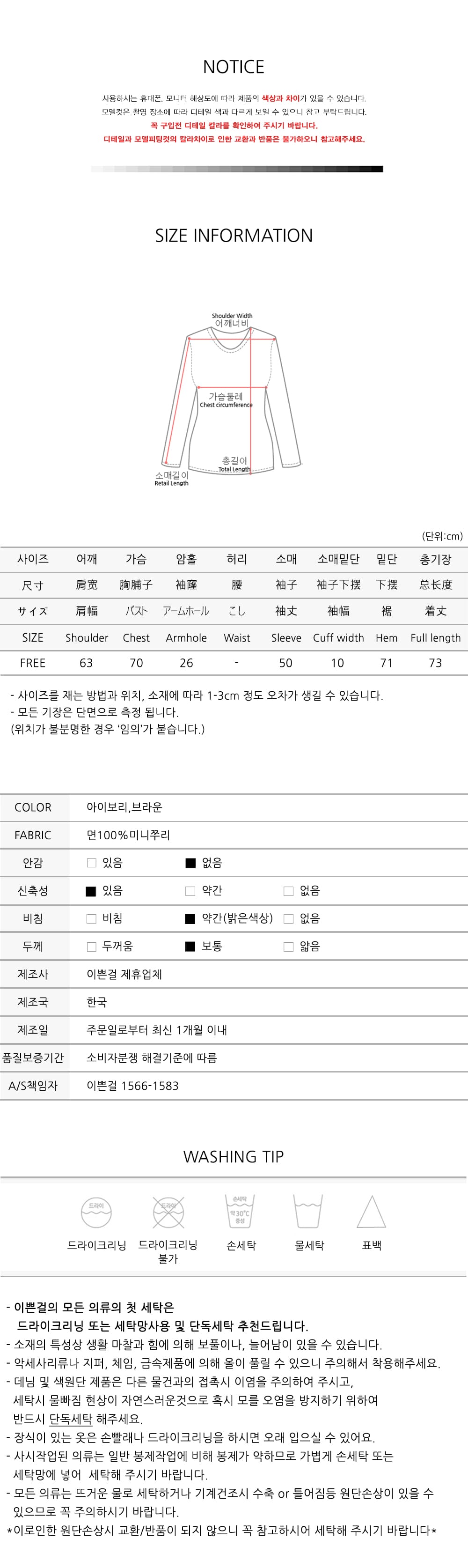 - COLOR / SIZE TIP- 컬러는 아이보리,브라운 2컬러 준비하였습니다 사이즈는 FREE로 44~88까지 준비되어 있습니다 *사람의 체형에 따라 핏팅감이 달라질 수 있으니 꼼꼼히 상세 사이즈표를 확인하여 주세요 JJ언니는 아이보리 착용하였습니다