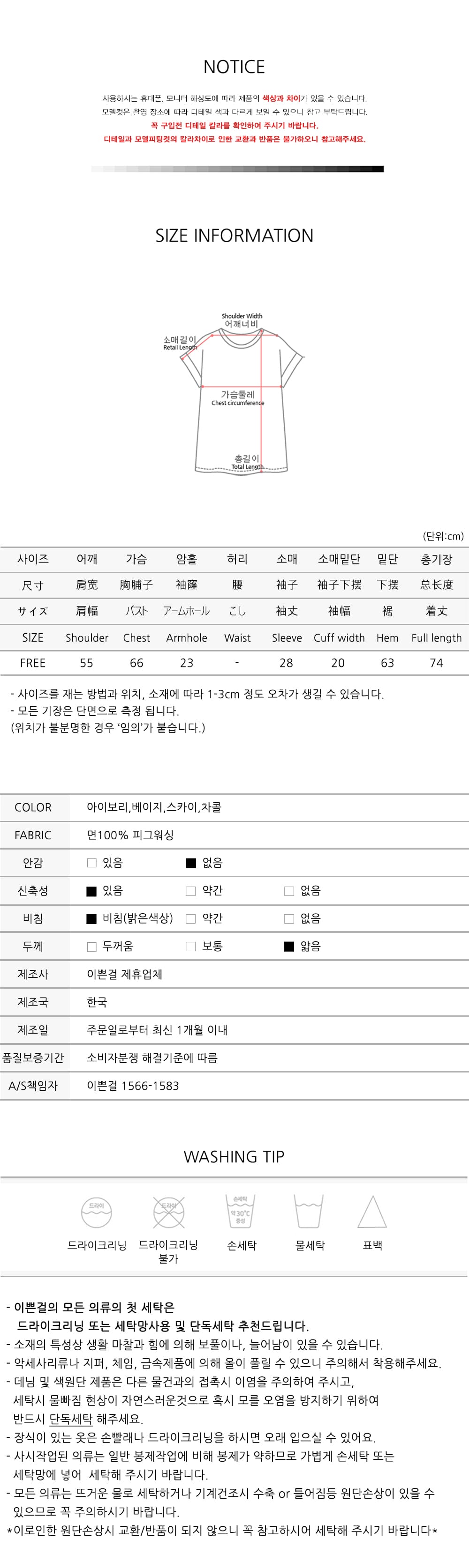 - COLOR / SIZE TIP- 컬러는 아이보리,베이지,스카이,차콜 4컬러 준비하였습니다 사이즈는 FREE로 44~88까지 준비되어 있습니다 *사람의 체형에 따라 핏팅감이 달라질 수 있으니 꼼꼼히 상세 사이즈표를 확인하여 주세요 JJ언니는 스카이 착용하였습니다